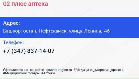 02 плюс, аптека по адресу Башкортостан, Нефтекамск, улица Ленина, 46 в дальнейшем Организация, размещена в следующих категориях: