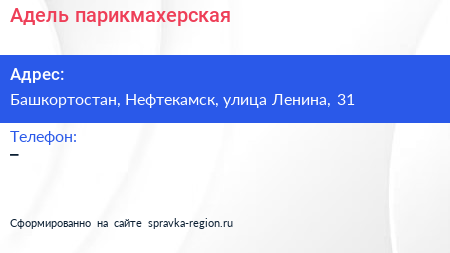 Адель, парикмахерская по адресу Башкортостан, Нефтекамск, улица Ленина, 31 в дальнейшем Организация, размещена в следующих категориях: