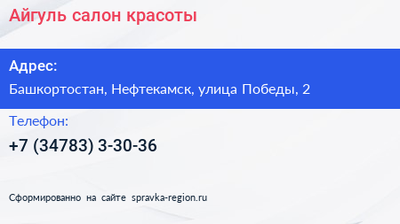 Айгуль, салон красоты по адресу Башкортостан, Нефтекамск, улица Победы, 2 в дальнейшем Организация, размещена в следующих категориях: