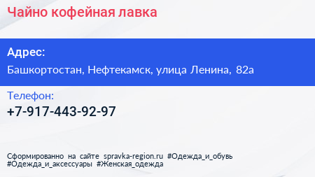 Чайно-кофейная лавка по адресу Башкортостан, Нефтекамск, улица Ленина, 82а в дальнейшем Организация, размещена в следующих категориях: