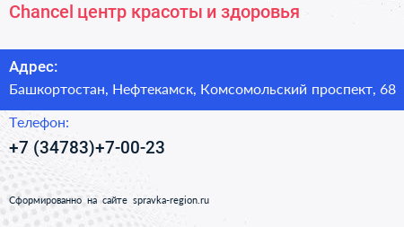 Chancel, центр красоты и здоровья по адресу Башкортостан, Нефтекамск, Комсомольский проспект, 68 в дальнейшем Организация, размещена в следующих категориях: