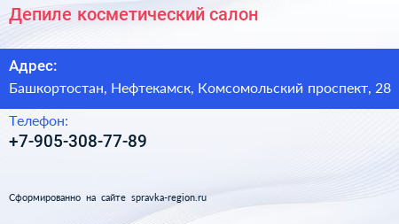 Депиле, косметический салон по адресу Башкортостан, Нефтекамск, Комсомольский проспект, 28 в дальнейшем Организация, размещена в следующих категориях: