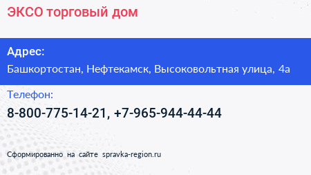 ЭКСО, торговый дом по адресу Башкортостан, Нефтекамск, Высоковольтная улица, 4а в дальнейшем Организация, размещена в следующих категориях: