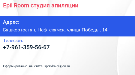 Epil Room, студия эпиляции по адресу Башкортостан, Нефтекамск, улица Победы, 14 в дальнейшем Организация, размещена в следующих категориях: