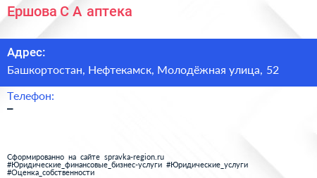 Ершова С.А, аптека по адресу Башкортостан, Нефтекамск, Молодёжная улица, 52 в дальнейшем Организация, размещена в следующих категориях: