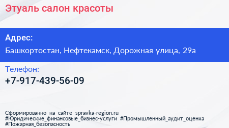 Этуаль, салон красоты по адресу Башкортостан, Нефтекамск, Дорожная улица, 29а в дальнейшем Организация, размещена в следующих категориях: