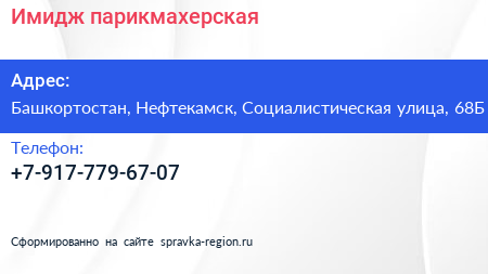 Имидж, парикмахерская по адресу Башкортостан, Нефтекамск, Социалистическая улица, 68Б в дальнейшем Организация, размещена в следующих категориях:
