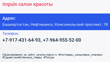 Impuls, салон красоты по адресу Башкортостан, Нефтекамск, Комсомольский проспект, 78 в дальнейшем Организация, размещена в следующих категориях: