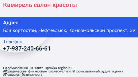 Камирель, салон красоты по адресу Башкортостан, Нефтекамск, Комсомольский проспект, 39 в дальнейшем Организация, размещена в следующих категориях: