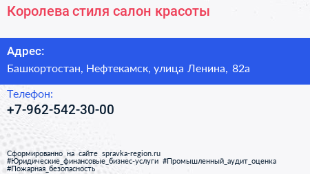 Королева стиля, салон красоты по адресу Башкортостан, Нефтекамск, улица Ленина, 82а в дальнейшем Организация, размещена в следующих категориях: