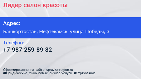 Лидер, салон красоты по адресу Башкортостан, Нефтекамск, улица Победы, 3 в дальнейшем Организация, размещена в следующих категориях: