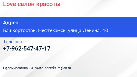 Love, салон красоты по адресу Башкортостан, Нефтекамск, улица Ленина, 10 в дальнейшем Организация, размещена в следующих категориях: