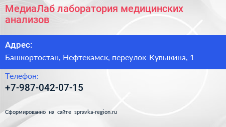 МедиаЛаб, лаборатория медицинских анализов по адресу Башкортостан, Нефтекамск, переулок Кувыкина, 1 в дальнейшем Организация, размещена в следующих категориях: