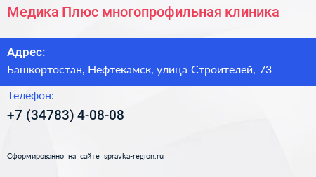 Медика Плюс, многопрофильная клиника по адресу Башкортостан, Нефтекамск, улица Строителей, 73 в дальнейшем Организация, размещена в следующих категориях: