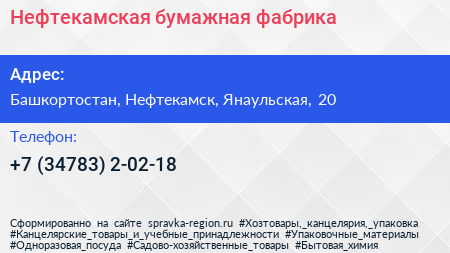 Нефтекамская бумажная фабрика по адресу Башкортостан, Нефтекамск, Янаульская, 20 в дальнейшем Организация, размещена в следующих категориях: