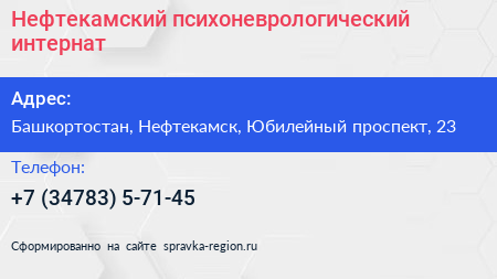 Нефтекамский психоневрологический интернат по адресу Башкортостан, Нефтекамск, Юбилейный проспект, 23 в дальнейшем Организация, размещена в следующих категориях: