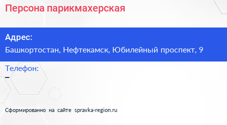 Персона, парикмахерская по адресу Башкортостан, Нефтекамск, Юбилейный проспект, 9 в дальнейшем Организация, размещена в следующих категориях: