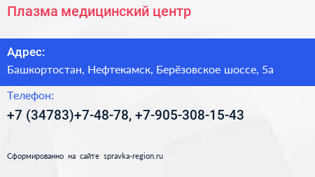 Плазма, медицинский центр по адресу Башкортостан, Нефтекамск, Берёзовское шоссе, 5а в дальнейшем Организация, размещена в следующих категориях:
