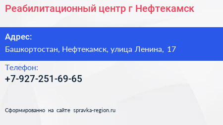 Реабилитационный центр, г. Нефтекамск по адресу Башкортостан, Нефтекамск, улица Ленина, 17 в дальнейшем Организация, размещена в следующих категориях: