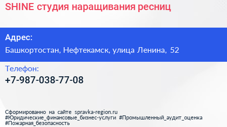 SHINE, студия наращивания ресниц по адресу Башкортостан, Нефтекамск, улица Ленина, 52 в дальнейшем Организация, размещена в следующих категориях: