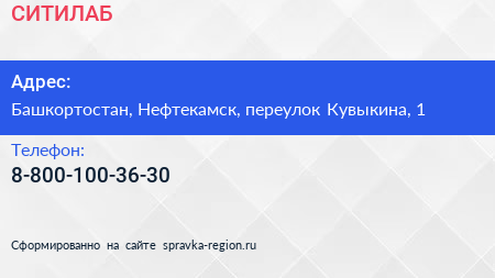 СИТИЛАБ по адресу Башкортостан, Нефтекамск, переулок Кувыкина, 1 в дальнейшем Организация, размещена в следующих категориях: