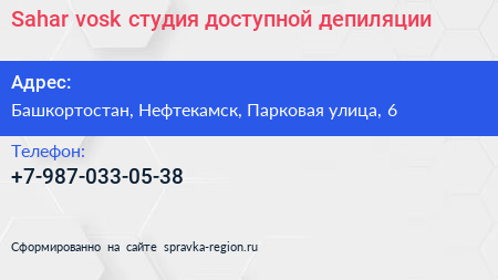 Sahar & vosk, студия доступной депиляции по адресу Башкортостан, Нефтекамск, Парковая улица, 6 в дальнейшем Организация, размещена в следующих категориях: