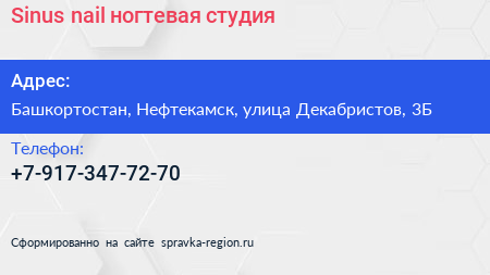 Sinus nail, ногтевая студия по адресу Башкортостан, Нефтекамск, улица Декабристов, 3Б в дальнейшем Организация, размещена в следующих категориях: