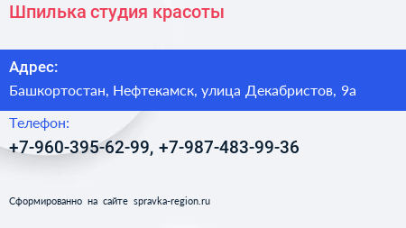 Шпилька, студия красоты по адресу Башкортостан, Нефтекамск, улица Декабристов, 9а в дальнейшем Организация, размещена в следующих категориях: