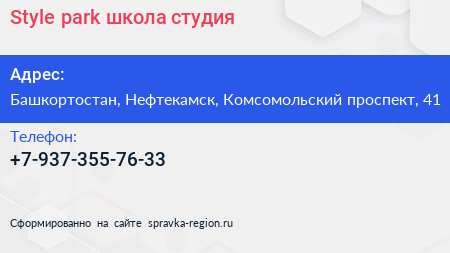Style park, школа-студия по адресу Башкортостан, Нефтекамск, Комсомольский проспект, 41 в дальнейшем Организация, размещена в следующих категориях: