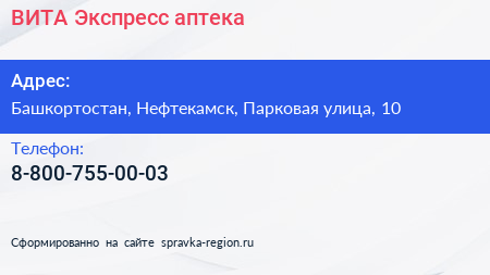 ВИТА Экспресс, аптека по адресу Башкортостан, Нефтекамск, Парковая улица, 10 в дальнейшем Организация, размещена в следующих категориях: