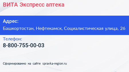 ВИТА Экспресс, аптека по адресу Башкортостан, Нефтекамск, Социалистическая улица, 26 в дальнейшем Организация, размещена в следующих категориях: