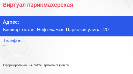 Виртуал, парикмахерская по адресу Башкортостан, Нефтекамск, Парковая улица, 20 в дальнейшем Организация, размещена в следующих категориях: