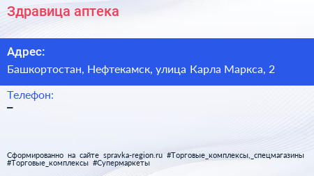 Здравица, аптека по адресу Башкортостан, Нефтекамск, улица Карла Маркса, 2 в дальнейшем Организация, размещена в следующих категориях: