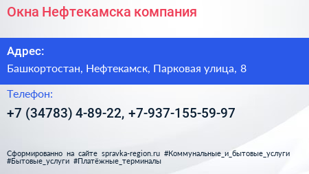 Окна Нефтекамска, компания по адресу Башкортостан, Нефтекамск, Парковая улица, 8 в дальнейшем Организация, размещена в следующих категориях: