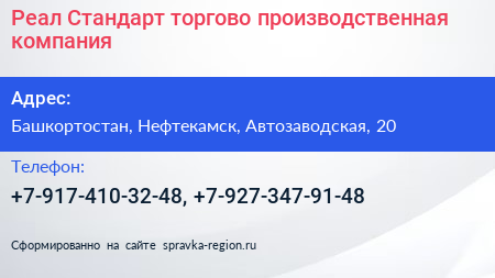 Реал-Стандарт, торгово-производственная компания по адресу Башкортостан, Нефтекамск, Автозаводская, 20 в дальнейшем Организация, размещена в следующих категориях:
