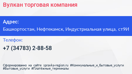 Вулкан, торговая компания по адресу Башкортостан, Нефтекамск, Индустриальная улица, ст9И в дальнейшем Организация, размещена в следующих категориях: