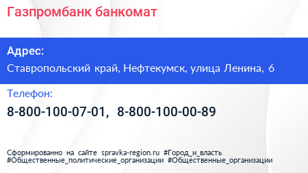 Газпромбанк, банкомат по адресу Ставропольский край, Нефтекумск, улица Ленина, 6 в дальнейшем Организация, размещена в следующих категориях: