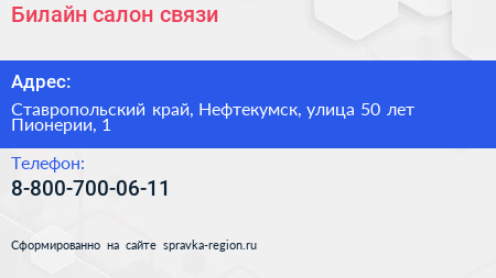 Билайн, салон связи по адресу Ставропольский край, Нефтекумск, улица 50 лет Пионерии, 1 в дальнейшем Организация, размещена в следующих категориях: