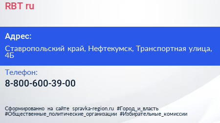 RBT.ru по адресу Ставропольский край, Нефтекумск, Транспортная улица, 4Б в дальнейшем Организация, размещена в следующих категориях: