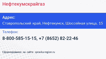 Нефтекумскрайгаз по адресу Ставропольский край, Нефтекумск, Шоссейная улица, 15 в дальнейшем Организация, размещена в следующих категориях: