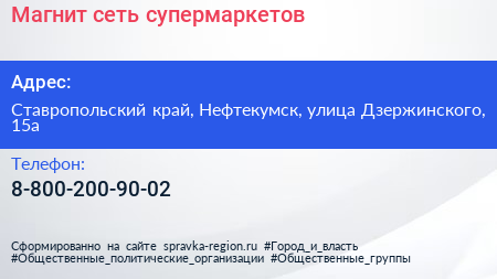 Магнит, сеть супермаркетов по адресу Ставропольский край, Нефтекумск, улица Дзержинского, 15а в дальнейшем Организация, размещена в следующих категориях: