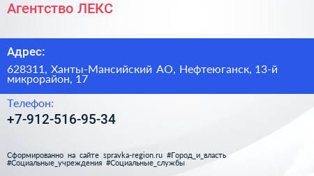 Агентство ЛЕКС по адресу 628311, Ханты-Мансийский АО, Нефтеюганск, 13-й микрорайон, 17 в дальнейшем Организация, размещена в следующих категориях: