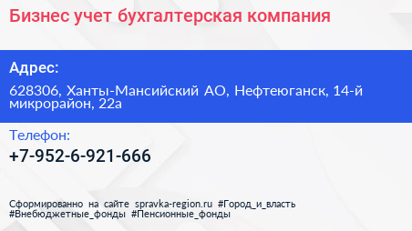 Бизнес-учет, бухгалтерская компания по адресу 628306, Ханты-Мансийский АО, Нефтеюганск, 14-й микрорайон, 22а в дальнейшем Организация, размещена в следующих категориях: