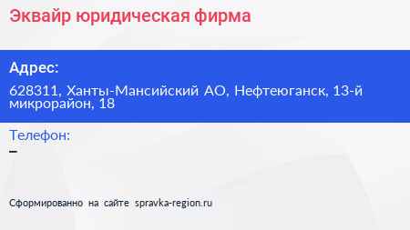 Эквайр, юридическая фирма по адресу 628311, Ханты-Мансийский АО, Нефтеюганск, 13-й микрорайон, 18 в дальнейшем Организация, размещена в следующих категориях: