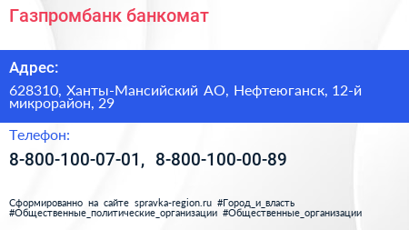 Газпромбанк, банкомат по адресу 628310, Ханты-Мансийский АО, Нефтеюганск, 12-й микрорайон, 29 в дальнейшем Организация, размещена в следующих категориях: