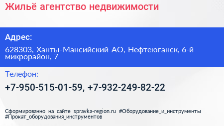 Жильё, агентство недвижимости по адресу 628303, Ханты-Мансийский АО, Нефтеюганск, 6-й микрорайон, 7 в дальнейшем Организация, размещена в следующих категориях: