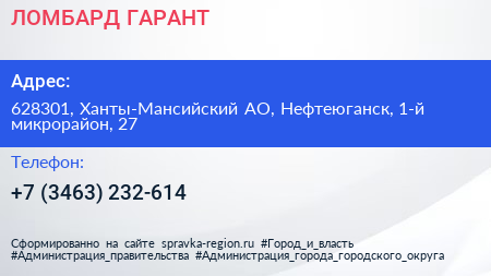 ЛОМБАРД ГАРАНТ по адресу 628301, Ханты-Мансийский АО, Нефтеюганск, 1-й микрорайон, 27 в дальнейшем Организация, размещена в следующих категориях: