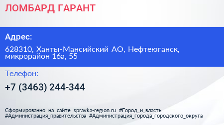 ЛОМБАРД ГАРАНТ по адресу 628310, Ханты-Мансийский АО, Нефтеюганск, микрорайон 16а, 55 в дальнейшем Организация, размещена в следующих категориях: