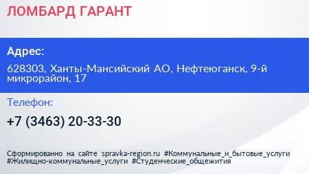 ЛОМБАРД ГАРАНТ по адресу 628303, Ханты-Мансийский АО, Нефтеюганск, 9-й микрорайон, 17 в дальнейшем Организация, размещена в следующих категориях: