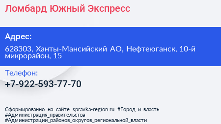 Ломбард Южный Экспресс по адресу 628303, Ханты-Мансийский АО, Нефтеюганск, 10-й микрорайон, 15 в дальнейшем Организация, размещена в следующих категориях: